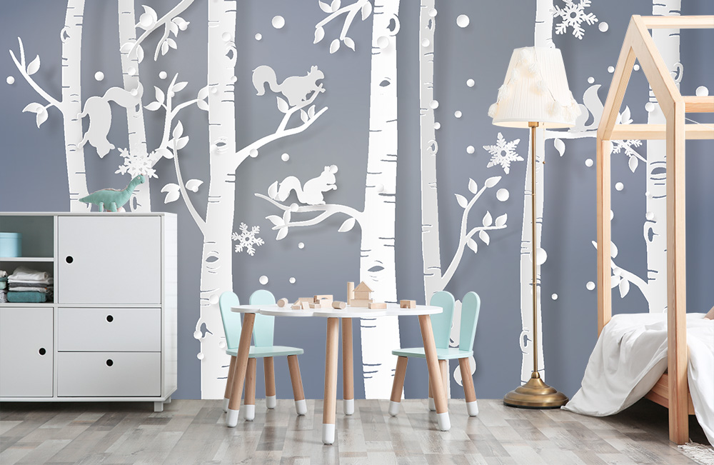 Preview: Kinderzimmer Fototapete Eichhörnchen im Birkenwald