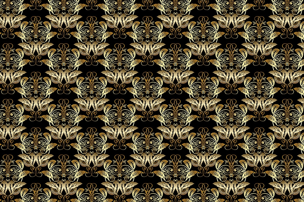 Mustertapete mit goldfarbenen Ornamenten im Barock-Stil