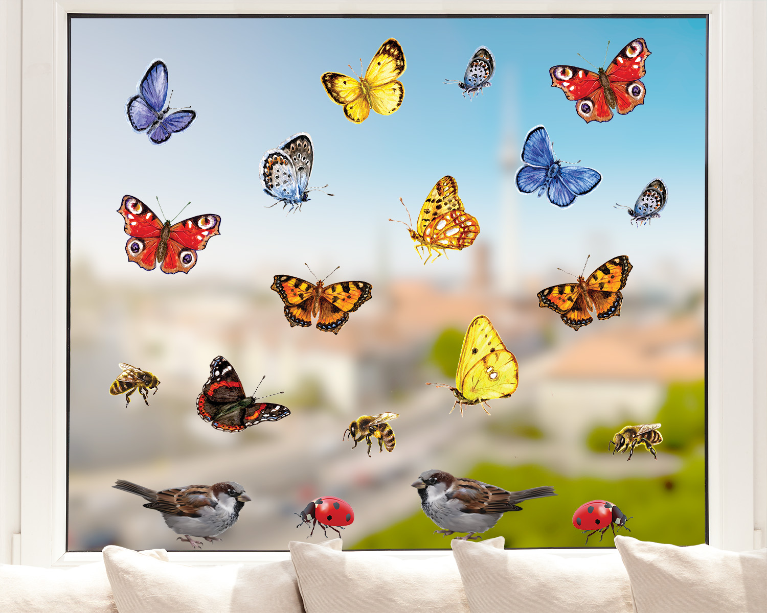 Flatternde Schmetterlinge, summende Bienen, zwitschernde Spatzen und gepunktete Marienkäfer. Ein Stickerset mit Sommerstimmung für Ihre Wohnräume.