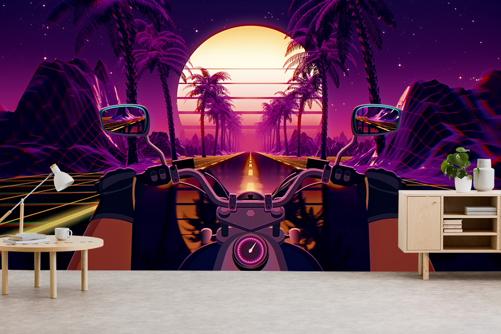 Vlies-Fototapete – Biker auf einer Palmen-Alle im 80er-Jahre-Stil