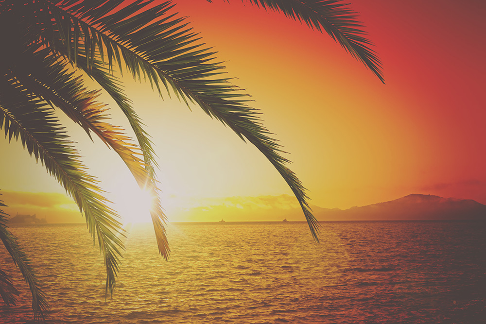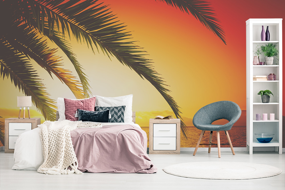 80s Retro-Fototapete Palmenblätter am Meer in der Abendsonne