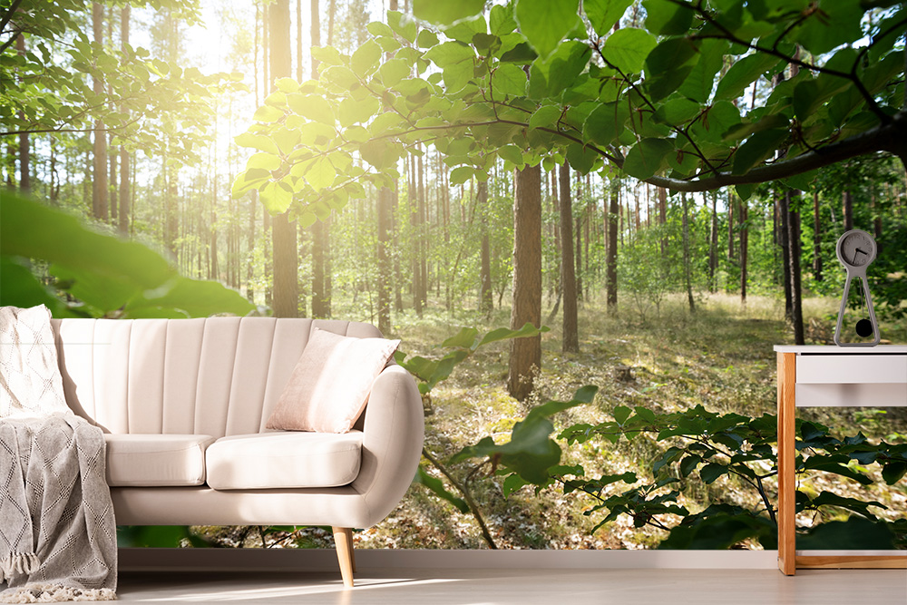 Fototapete aus Vlies mit einem Waldmotiv an einer Wand im Wohnzimmer