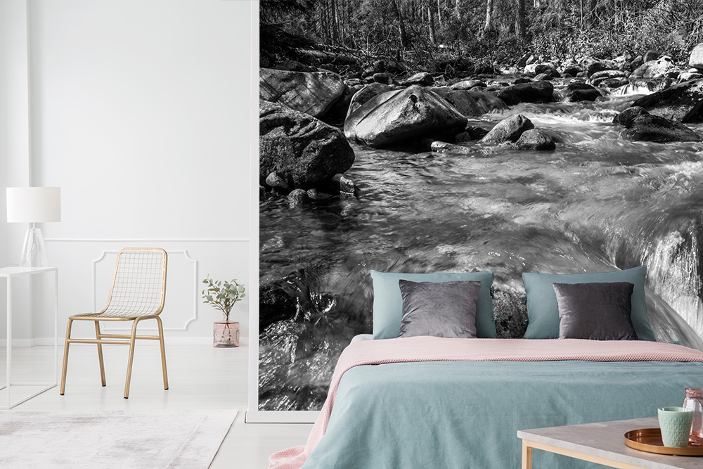 Preview: Schwarz-Weiß Fototapete Fluss im Gebirge