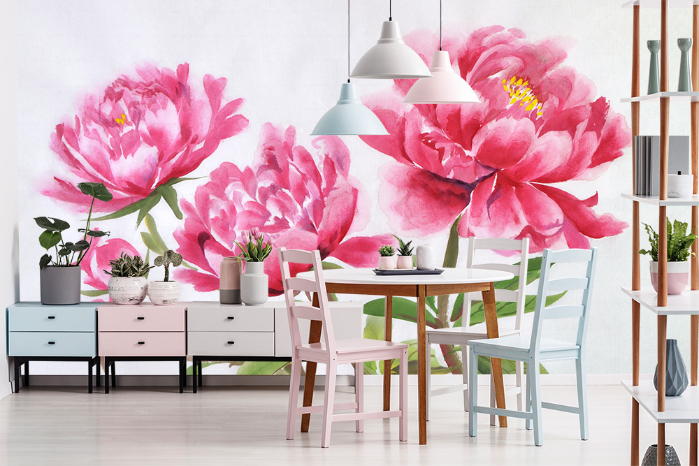 Blumen-Fototapete mit roten Pfingstrosen im Wasserfarben-Look