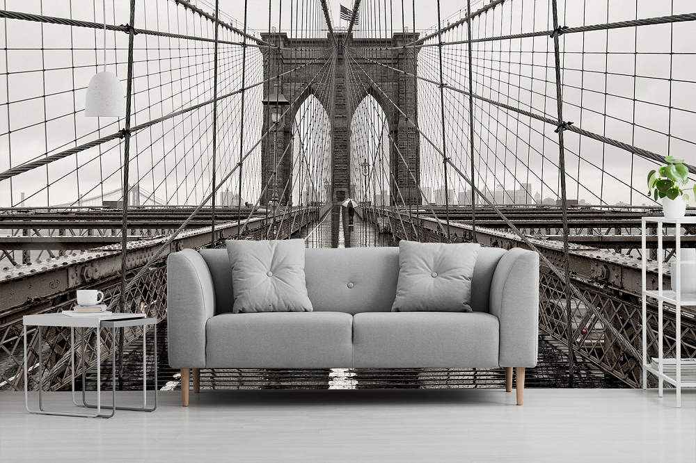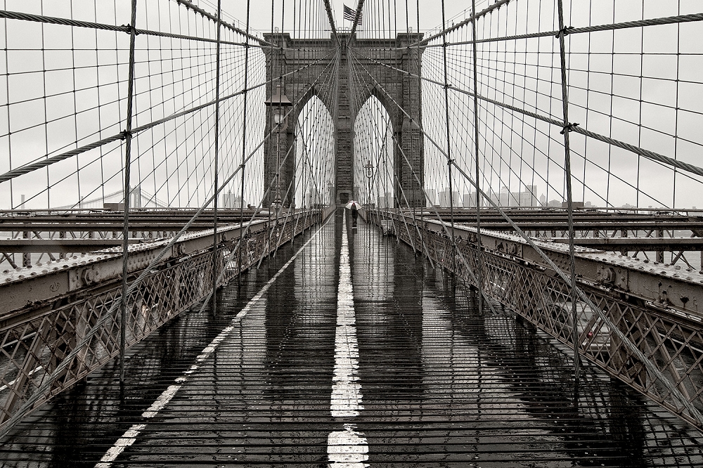Die Brooklyn Bridge in New York in Schwarz-Weiß als 3D-Fototapete. Dieses Motiv hat eine starke Tiefenwirkung. Der Blick über die Brücke entlang des Gehwegs bei Regenwetter. Weiter hinten steht jemand mit einem Regenschirm, was die Stimmung unterstreicht. Zudem gibt es etwas zu entdecken, was das Motiv etwas geheimnisvoll macht. Das Motiv ist fotografisch in Schwarz-Weiß mit einem leichten Sepiastich gehalten. Dies reduziert das Motiv auf das Wesentliche und der Betrachter kann sich voll auf die Architektur der bekannten Brücke einlassen. Auch unterstützt es die Bildstimmung. Als Großformat an Ihrer Wand kommt das Bild besonders zur Geltung. Ein zeitloses Motiv für das Wohnzimmer, Schlafzimmer, Esszimmer oder den Flur. Auch in Geschäftsräumen kann es als Wanddekoration passend in Szene gesetzt werden. Geschäftsräume können z.B. Arztpraxen, Büros oder Kanzleien sein. Eine ästhetische Wandgestaltung für Ihr Zuhause oder den Arbeitsplatz.