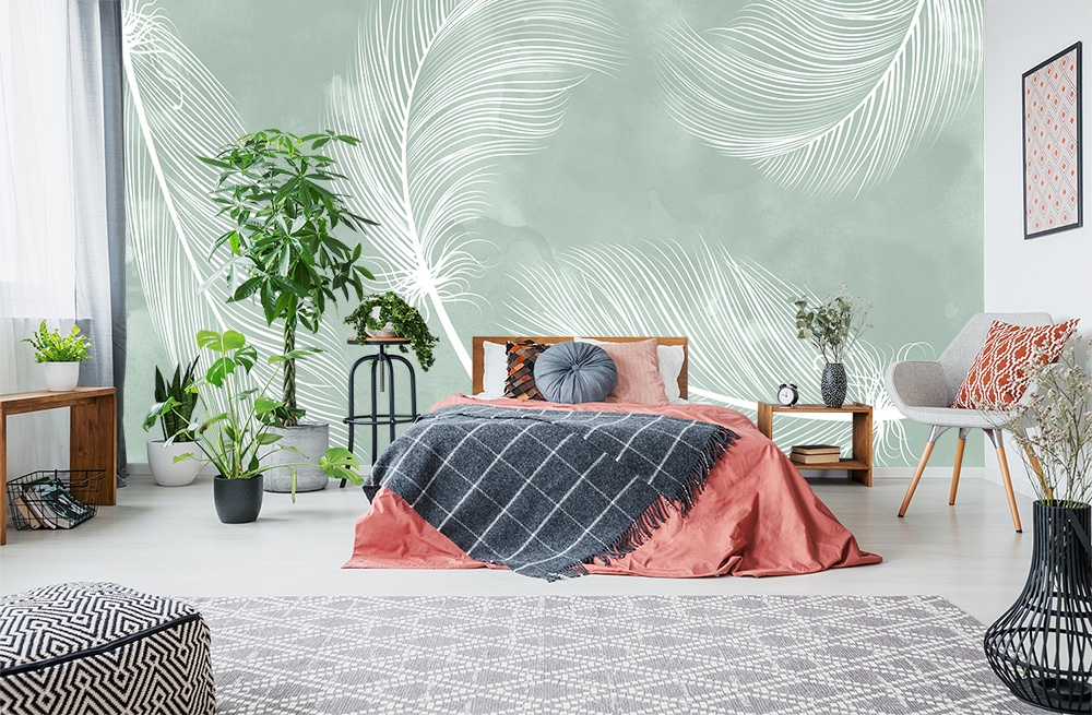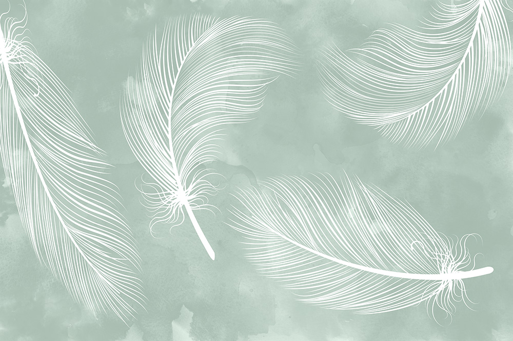 Fototapete mit Federn auf grünem Wasserfarben-Hintergrund
