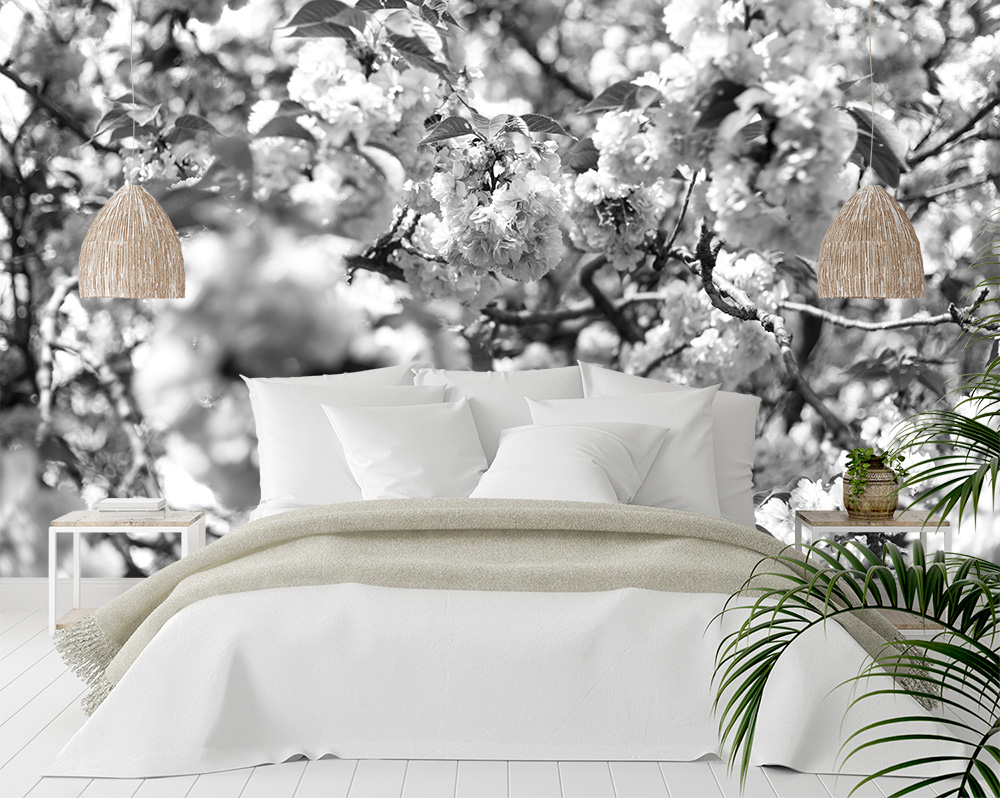 Preview: Fototapete japanische Zierkirsche in Schwarzweiß