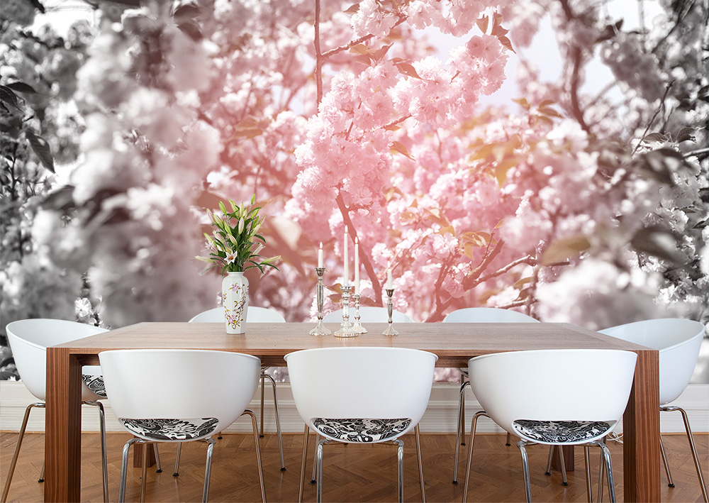 Preview: Fototapete Kirschblüte in Schwarzweiß und Rosatönen