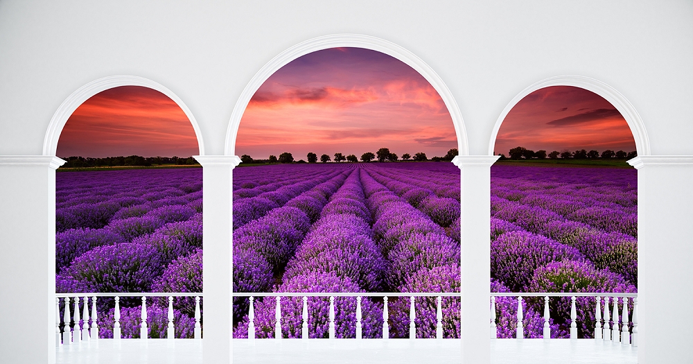 Blick von einem Balkon mit Rundbögen auf ein Lavendelfeld auf hochwertiger Fototapete. Dieser Blick ist einzigartig. Ein luxuriöser Balkon mit Rundbögen ganz in Weiß. Der Balkon stellt einen farblichen Kontrast zum Hintergrund her. Ein großes Lavendelfeld in der Abendstimmung mit einem überwältigenden Himmel in Rottönen und Violett. Genießen Sie in Ihrem Zuhause diesen romantischen Ausblick, wann immer Sie möchten. Mit einer Fototapete als Wanddekoration ist dies möglich.