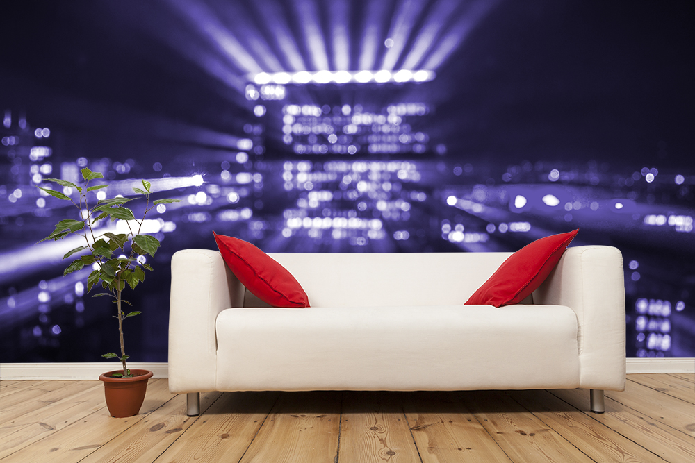 Preview: Vlies-Fototapete violette Lichter von Berlin in einem Wohnzimmer