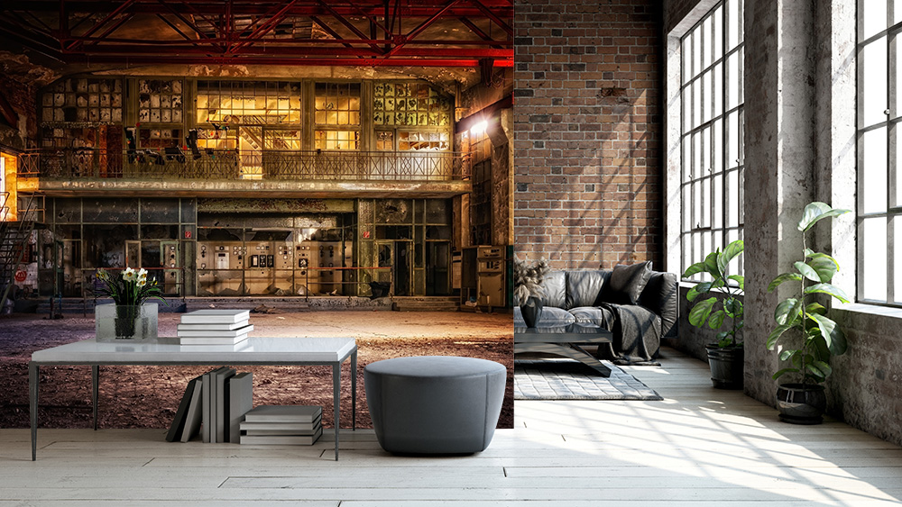 Preview: Lost Place Fototapete mit Bedienelementen in einer Fabrik