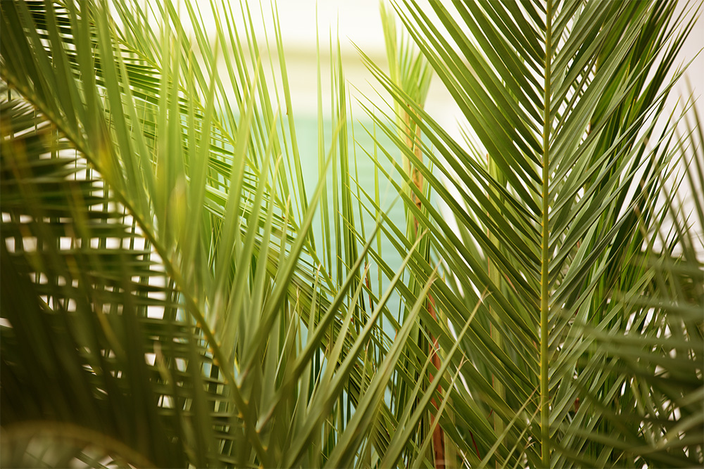 Fototapete mit Palmenblättern im Sonnenlicht