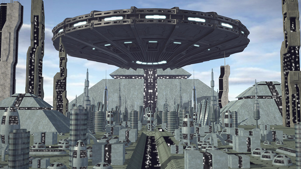Preview: Fototapete Science-Fiction Stadt mit Ufo