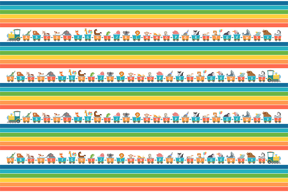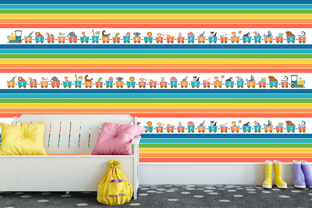Kindertapete mit bunten Streifen und dem ABC auf einer Eisenbahn