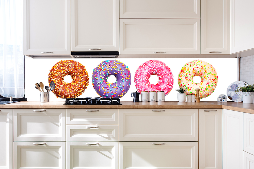 Vier bunte Donuts auf einem weißen Hintergrund als hochwertiger Druck auf Küchenrückwand. Diese Küchenrückwand können Sie als Alu-Dibond oder als Hart-PVC bestellen. Versüßen Sie die Deko Ihrer Küche mit diesem Motiv.