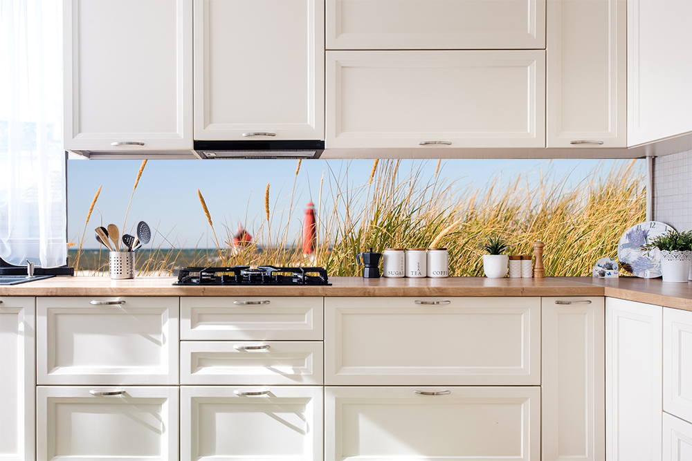 Dünengräser, ein Leuchtturm und das Meer als Küchenrückwand für Ihre Küche. Dieses maritime Motiv inspiriert Sie beim Zaubern der Speisen. Die Küchenrückwand können Sie als Hart-PVC oder als Alu-Dibond bestellen. Beide Materialien sind mit Laminat beschichtet, damit Sie problemlos die Oberfläche reinigen können.
