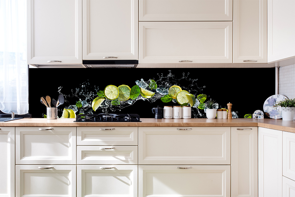 Ein Bogen mit Limetten, Zitronen und Eiswürfeln als Küchenrückwand. Das Motiv mit schwarzem Hintergrund schafft einen guten Kontrast zu dem frischen Obst. Es passt zu Cocktails für z.B. Bars oder Restaurants. Auch in der heimischen Küche kann es ein geeigneter Hintergrund für Ihre Küche sein.