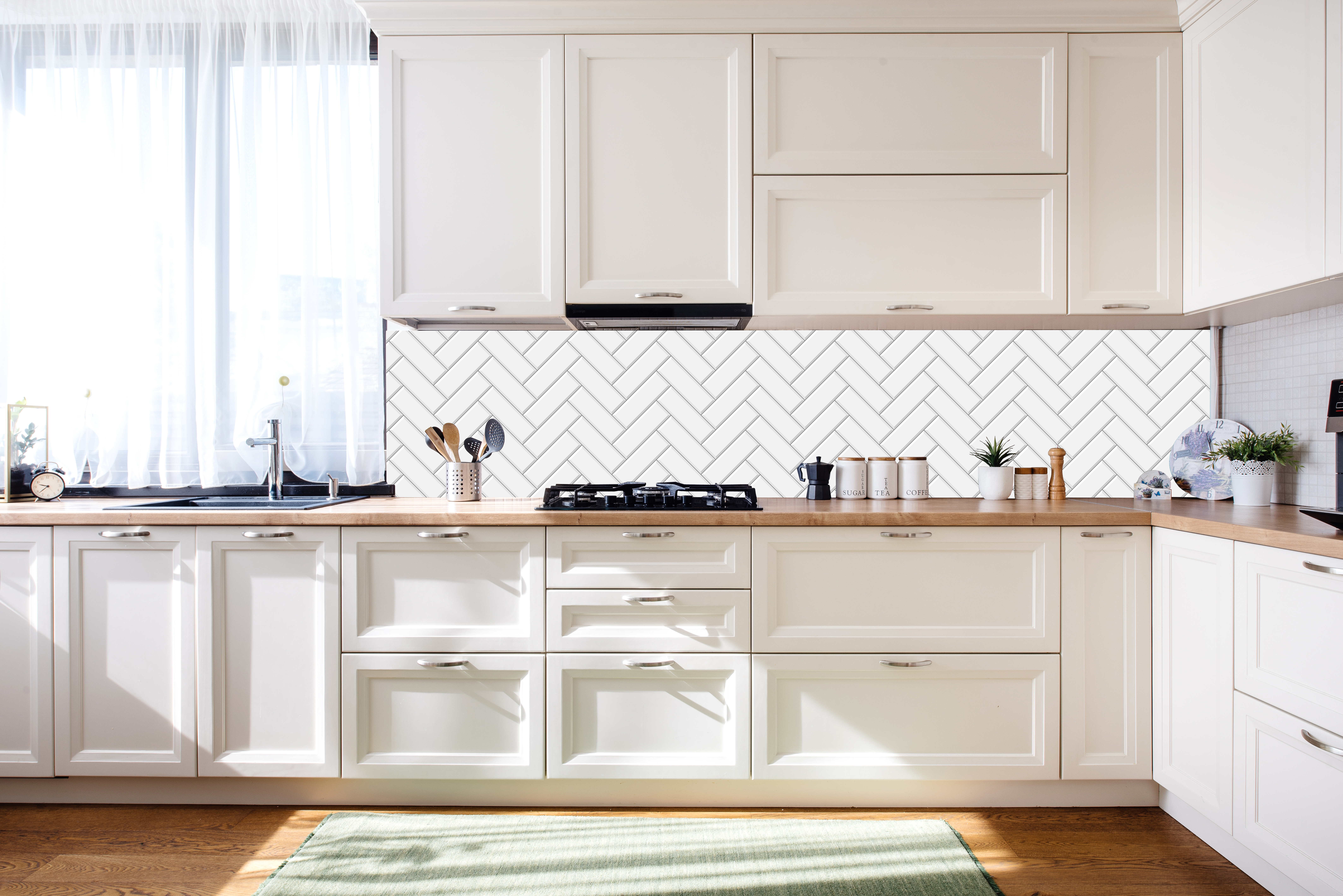 Weiße Keramikfliesen im Fischgrätmuster als hochwertige Küchenrückwand nach Maß. Sie möchten nicht selbst fliesen? Mit dieser Küchenrückwand können Sie im Handumdrehen Ihre Küchenrückwand in eine geflieste Wand verwandeln.