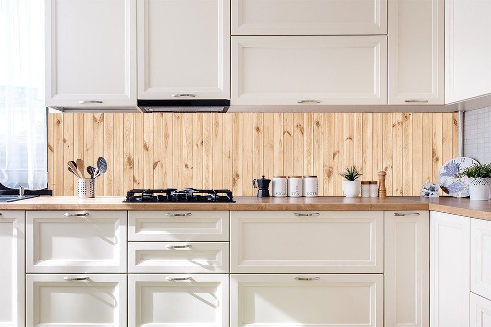 Natürliche Holzoptik mit einem hellen Holzhintergrund als Küchenrückwand. Bestellen Sie diese Küchenrückwand für Ihre Küche und schaffen Sie sich einen gemütlichen skandinavischen Look.