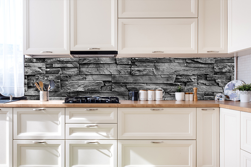 Graue Steinwand als Küchenrückwand auf Alu-Dibond oder Hart-PVC. Mit dieser Küchenrückwand geben Sie Ihrer Küche einen rustikalen und modernen Stil.