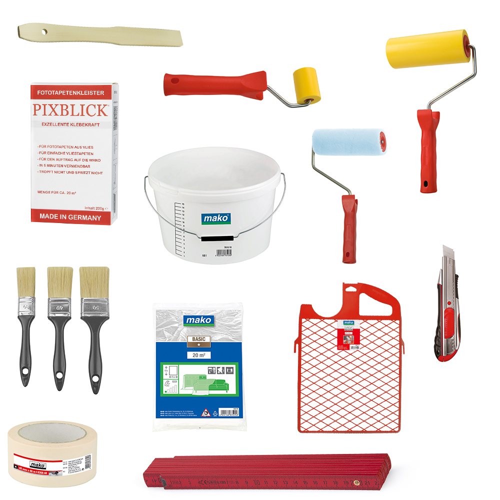 Großes XL-Tapezierset für Fototapeten aus Vlies. Bestellen Sie im Pixblick Onlineshop dieses umfangreiche Tapezierwerkzeug-Set zum Anbringen Ihrer Fototapete aus Vlies. Alle Werkzeuge sind Markenwerkzeuge. Das Set beinhaltet folgende Werkzeuge: 1 Kleisterroller (18 cm Rollenbreite), 1 Andrückroller für Tapeten, 1 Nahtroller, 1 Tapezierklebeband (40 m), 1x Abdeckfolie, 1 roter Zollstock, 1 Abstreifgitter für Kleister, 1 Tapeziermesser, 3 Pinsel in unterschiedlichen Größen für Kleisterfeinarbeiten und ein Rührholz aus Birkenholz. Zusätzlich gibt es zu dem Set den hochwertigen Pixblick Kleister für Vlies-Fototapeten. Damit Ihre Tapezieraktion perfekt läuft!