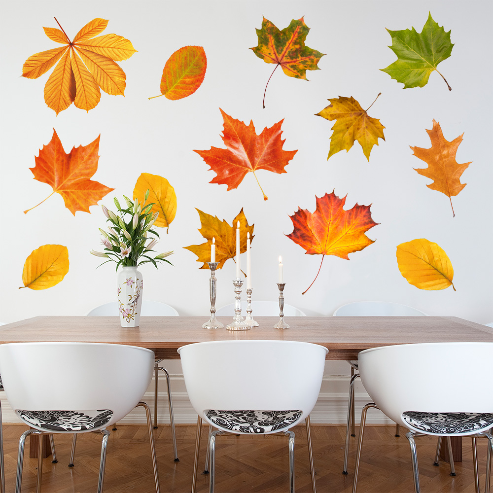 Fotorealistische Herbstblätter mit 13 verschiedenen Blättern als hochwertiges Wandtattoo. Das Wandaufkleber-Set bringt den Herbst in Ihr Zuhause. Ahornblätter, Eichenblättern, Kastanienblätter und weitere Blattarten - wie echt. Eine moderne Wanddekoration, die Sie völlig frei an Ihre Wand platzieren können. Einfach abziehen und aufkleben.